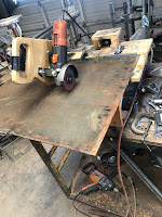 Here I have removed the front plate to cut a strip off a sheet of 1/8" steel longer than the travel of the grinder. This is after I flipped the sheet to make the 2nd cut.